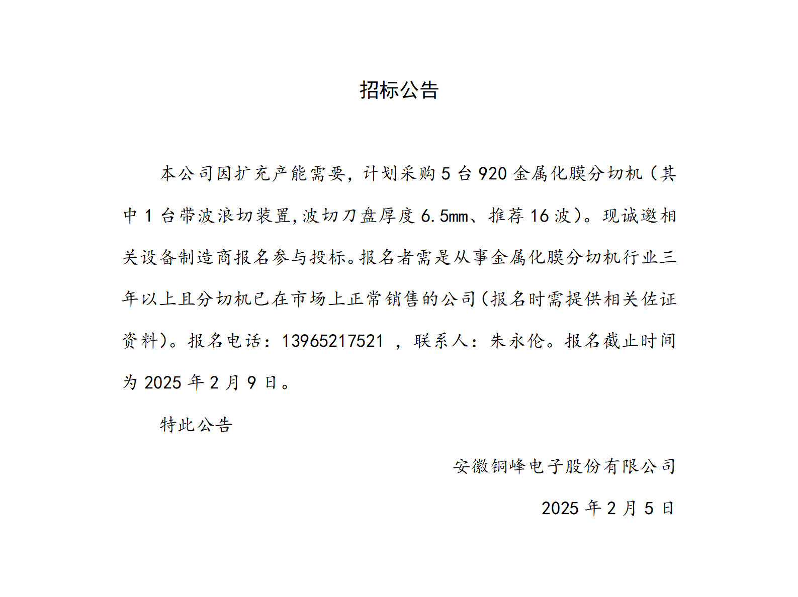 铜峰工业园新能源用电子元器件厂房项目消防工程补充公告
