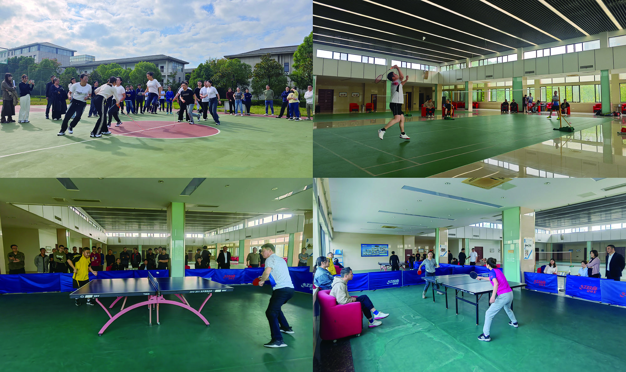 篮球、拔河、十人八字跳绳比赛项目中,队员们团结协作,配合默契,奋勇拼搏。乒、羽比赛项目中,运动员们展现技艺,“乒”出风采、谁“羽”争锋,尽情享受运动带来的快乐。