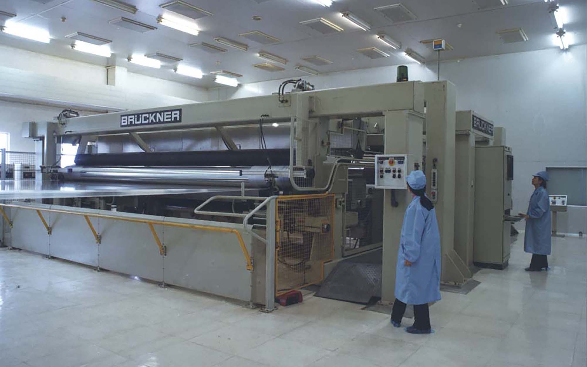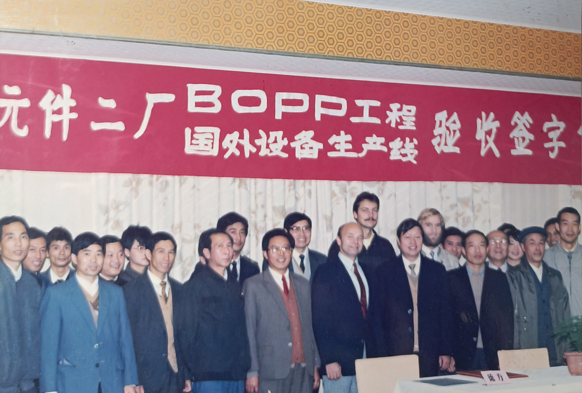 铜峰“老一线”于1989年建成投产。上世纪80年代,当时国内电容器用聚丙烯膜几乎完全依赖进口,严重制约了我国电容器等相关产业的发展。铜峰公司前身铜陵市无线电元件二厂积极响应国家需求,决定从国外引进双向拉伸电容器用聚丙烯膜生产线。1985年项目启动,经过一系列筹备工作,1986年获得国家计委批准立项,并被列入国家 “七五” 机械电子工业重点技改项目。1988年,主线和相关辅助设备成功引进。经过一年多的紧张建设,1989年生产线正式投产。“老一线”的建成投产,是铜峰发展史上具有重要意义的转折点。该线加速了铜峰公司产品结构调整和转型步伐,并由此形成了全国唯一的“电工三膜”(电容薄膜、金属化膜和薄膜电容器)一条龙的生产格局,使企业的经济规模和技术水平跃上一个新台阶。