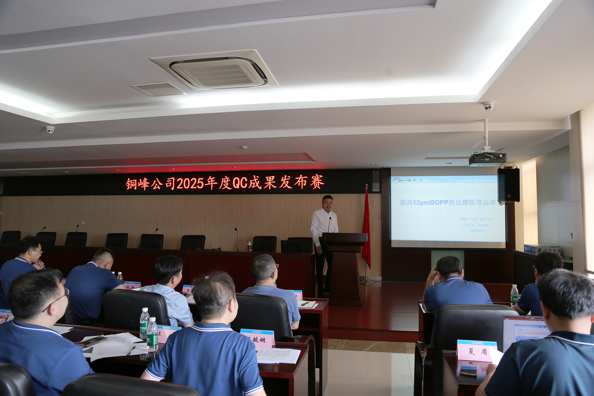 为确保评审的专业性与公平性,本次发布会由公司技术质量专家组成专业评审团。评委们从项目选题的针对性、问题分析的科学性、改进措施的有效性、成果效益的显著性以及现场发布表现等多个维度对各项目进行了严格、综合的评分,并逐一给予了细致点评。评审既充分肯定了各小组的努力付出与突出贡献,也针对性地提出了极具建设性的改进建议。经评委独立打分,薄膜分公司《提高12μmBOPP粗化膜优等品率》项目成果荣获一等奖,铜爱公司《提高超宽膜分切优等品率》项目成果荣获二等奖,配件分公司《提高椭圆型铝壳合格率》、电容器分公司《提高引线压接端子合格率》、镀膜分公司《消除金属化膜卷边现象》等三个项目成果荣获三等奖。