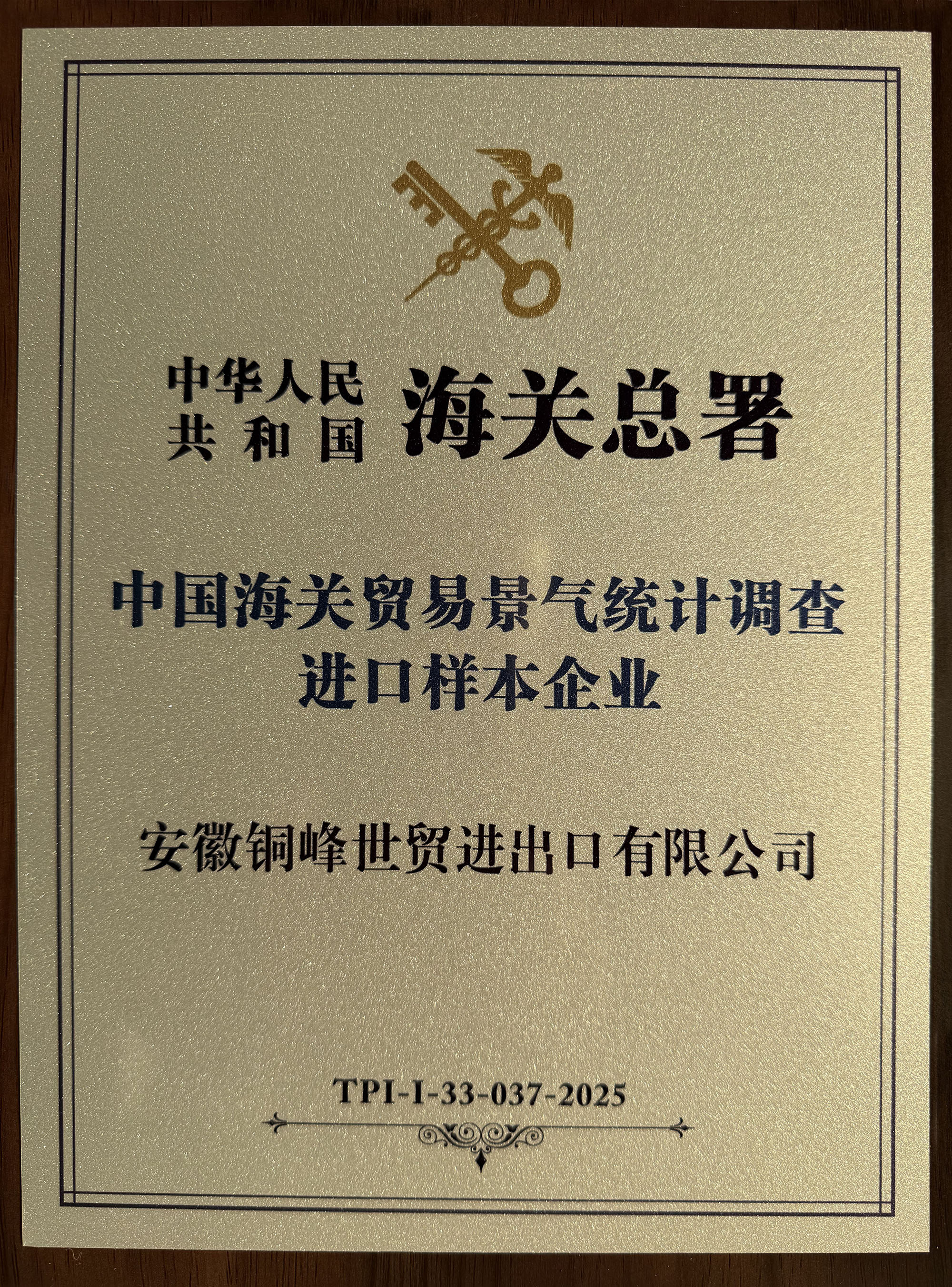 近日,公司全资子公司安徽铜峰世贸进出口有限公司凭借其卓越的进出口业绩、规范严谨的经营管理以及高质量的统计申报数据,成功获得海关总署授予的“中国海关贸易景气统计调查进口样本企业”荣誉称号。