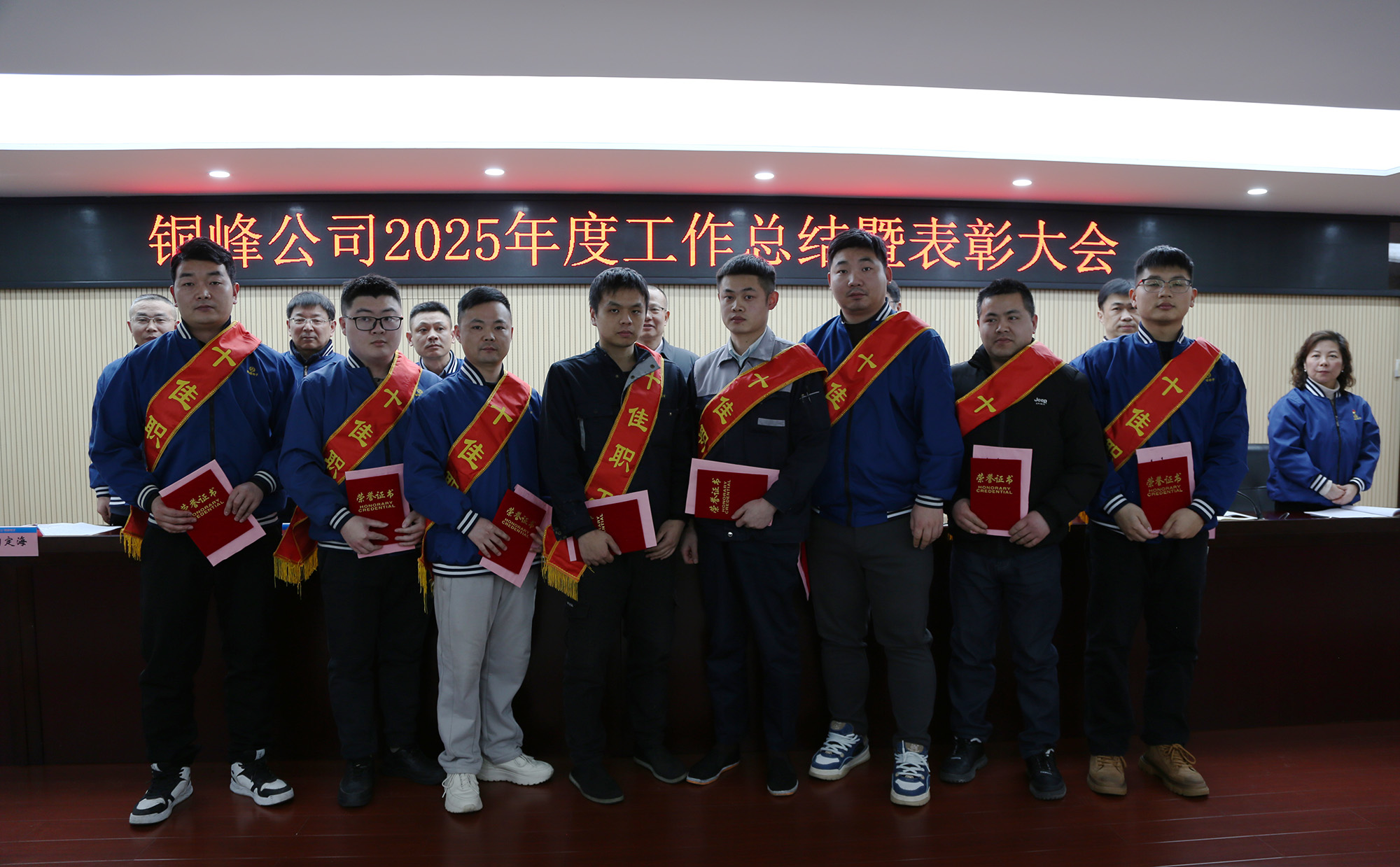 与会领导为受表彰的2025年度公司“十佳职工”颁发荣誉证书及奖金。“十佳职工”、经营单位和职能部门代表分别作表态发言。