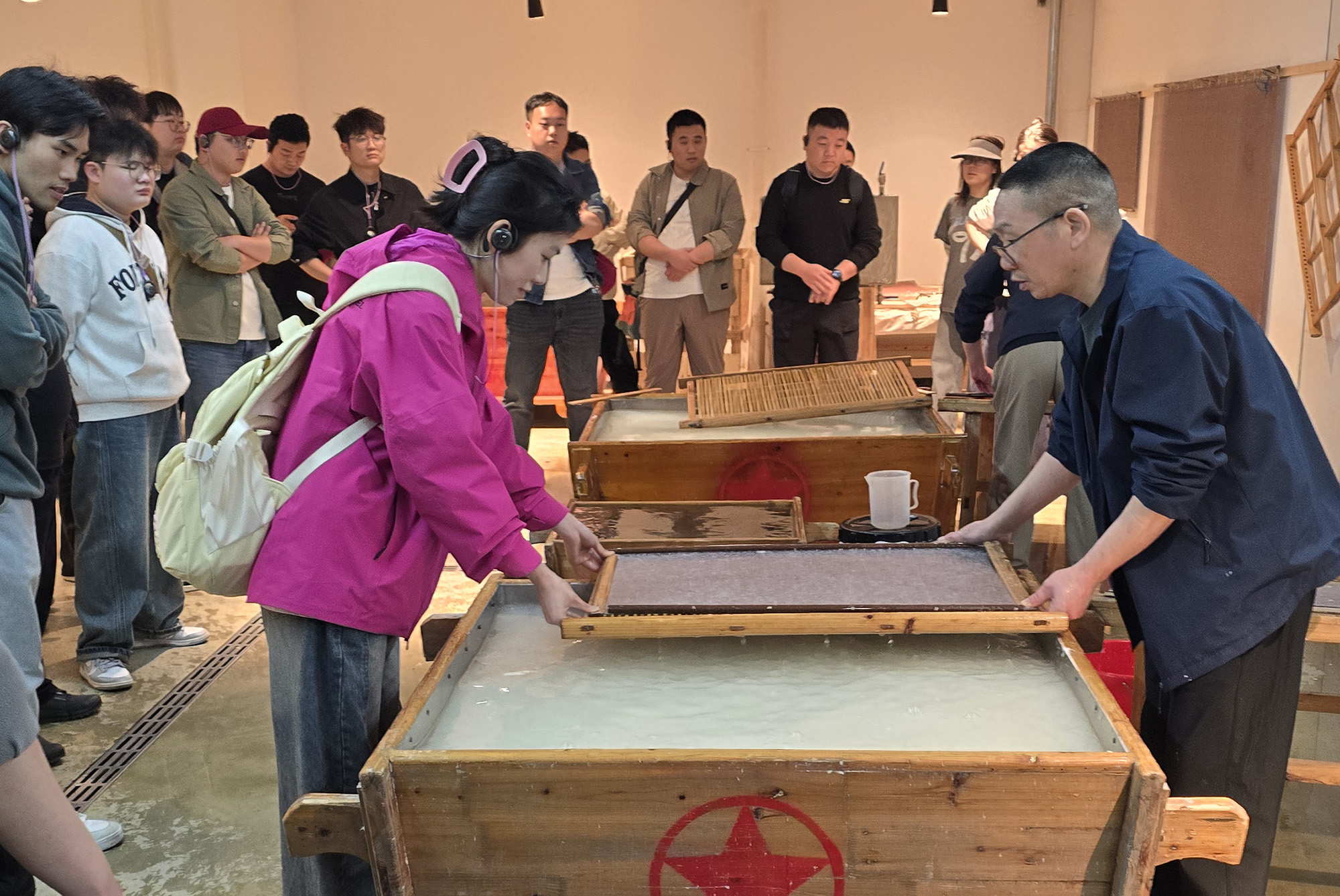 活动首站来到中国宣纸文化园。在专业讲解员的引导下,青年员工们依次参观了网红打卡点“国纸客厅”和底蕴深厚的宣纸博物馆,系统了解宣纸的千年历史、独特原料与精湛工艺。随后,大家亲自上手,分批体验了古法捞纸技艺。亲手将纸浆入帘、成型、压榨,每一道工序都让参与者深刻体会到“片纸来之不易”的匠心精神。在世界最大的“三丈三”巨宣制作车间,大家目睹40余人共同协作制作11米巨幅宣纸的震撼场面,现场感受这项人类非物质文化遗产的博大精深。